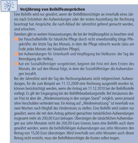 Aufwendungen, die nicht innerhalb eines Jahres nach dem Zeitpunkt ihrer Entstehung (Inanspruchnahme des Arztes, Tag der Krankenhausbehandlung, des Einkaufs von Arzneien oder Hilfsmitteln, der Heilbehandlung) oder spätestens ein Jahr nach der ersten Ausstellung der Rechnung geltend gemacht werden, verfallen.