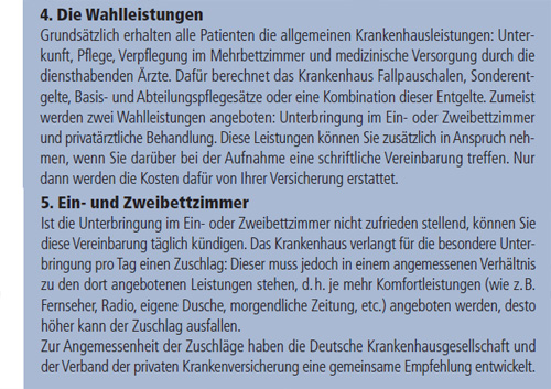 - die voll- und teilstationäre sowie die vor- und nachstationäre Krankenhausbehandlung (Wahlleistungen: gesondert berechnete wahlärztliche Leistungen [§ 22 Bundespflegeversicherungsgesetz – BPflV], gesondert berechnete Unterkunft [§ 22 BPflV] bis zur Höhe der Kosten eines Zweibettzimmers abzüglich eines Betrages von 14,50 Euro täglich),