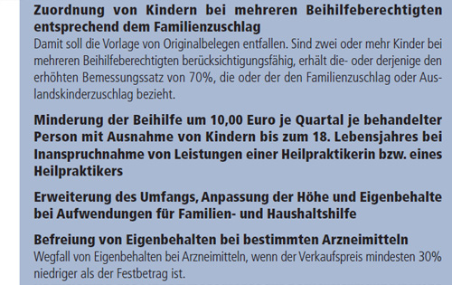 Beihilfen werden zu den beihilfefähigen Aufwendungen der beihilfeberechtigten Personen und ihrer berücksichtigungsfähigen Angehörigen gewährt. Unter berücksichtigungsfähigen Angehörigen sind der Ehegatte des Beihilfeberechtigten, der nicht selbst beihilfeberechtigt ist, sowie die im Familienzuschlag berücksichtigungsfähigen Kinder des Beihilfeberechtigten zu verstehen. Die Mutter eines nichtehelichen Kindes des Beihilfe berechtigten gilt ebenfalls als berücksichtigungsfähige Angehörige. Im Januar 2011 sollen eingetragene Lebenspartner ebenfalls als berücksichtigungsfähige Angehörige in die Bundesbeihilfeverordnung einbezogen werden.