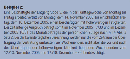 Wie bisher wird die vom Arbeitgeber kraft Direktionsrechts angeordnete vorübergehende Ausübung einer höherwertigen Tätigkeit durch eine persönliche Zulage vergütet (§ 14 Abs. 1); Eingruppierung und Inhalt des Arbeitsvertrages bleiben unverändert. Der Anspruch auf die Zahlung der Zulage entsteht, wenn die/der Beschäftigte die höherwertige Tätigkeit mindestens einen Monat ausgeübt hat (§ 14 Abs. 1). Anders als nach § 24 BAT/BAT-O, aber entsprechend den bislang für den Arbeiterbereich geltenden Regelungen wird die Zulage rückwirkend ab dem ersten Tag der Übertragung für die gesamte Dauer der Ausübung gezahlt.