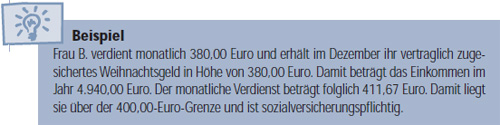 Auch Minijobber haben Anspruch auf Urlaubs- und Weihnachtsgeld, wenn dies im Tarif- oder Arbeitsvertrag festgelegt ist. Wird durch die Zahlung von Urlaubs- oder Weihnachtsgeld die 400-Euro-Grenze überschritten, wird die Beschäftigung sozialversicherungspflichtig.
