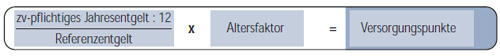Jedem Pflichtversicherten werden künftig – jeweils abhängig von Einkommen (Beitrag) und Lebensalter – Versorgungspunkte gutgeschrieben. Darüber hinaus können sich die Versorgungspunkte durch die Berücksichtigung sozialer Komponenten und die Gutschrift von Bonuspunkten erhöhen. Für die Ermittlung des Versorgungsanspruchs (Regelversorgung) wird die Summe der bis zum Versorgungsfall angesammelten Versorgungspunkte mit einem im Versorgungs-Tarifvertrag festgelegten Faktor multipliziert. Das betriebsrentenpflichtige Entgelt wird ins Verhältnis zu einem Referenzentgelt gesetzt und mit dem für das Alter des Versicherten im jeweiligen Jahr maßgebenden Altersfaktor multipliziert. Der Altersfaktor ist bei jüngeren Versicherten höher als bei älteren.