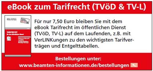 Sie sind oder waren im öffentlichen Dienst beschäftigt und sind solidarisch? Unterstützen Sie den INFO-SERVICE mit seiner Arbeit für Beamte und Angestellte im öffentlichen Dienst mit der Förderung von 1 x jährlich in Höhe von 10 Euro. Als Danke geben wir Ihnen den Persönlichen Zugang zu unserem OnlineService, mit dem Sie alle Publikationen (u.a. Bücher und eBooks) herunterladen, lesen und ausdrucken können.>>> Hier können Sie uns unterstützen. Noch schneller geht es >>>online |
